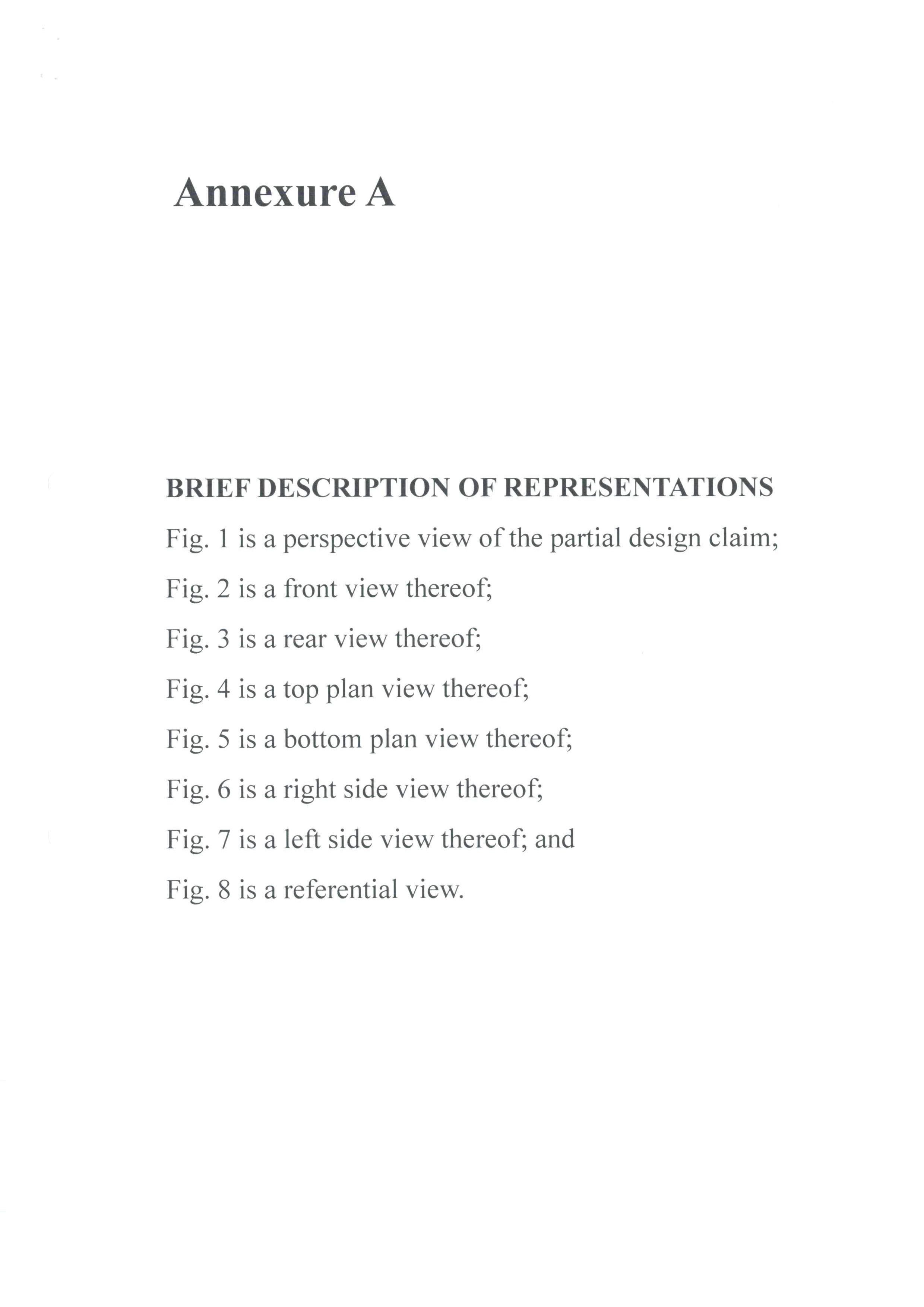 BRIEF DESCRIPTION OF REPRESENTATIONS Fig.1 is a perspective view of the partial design claim; Fig.2 is a front view thereof; Fig.3 is a rear view thereof; Fig.4 is a top plan view thereof; Fig.5 is a bottom plan view thereof; Fig.6 is a right side view thereof; Fig.7 is a left side view thereof; and Fig.8 ia a referential view