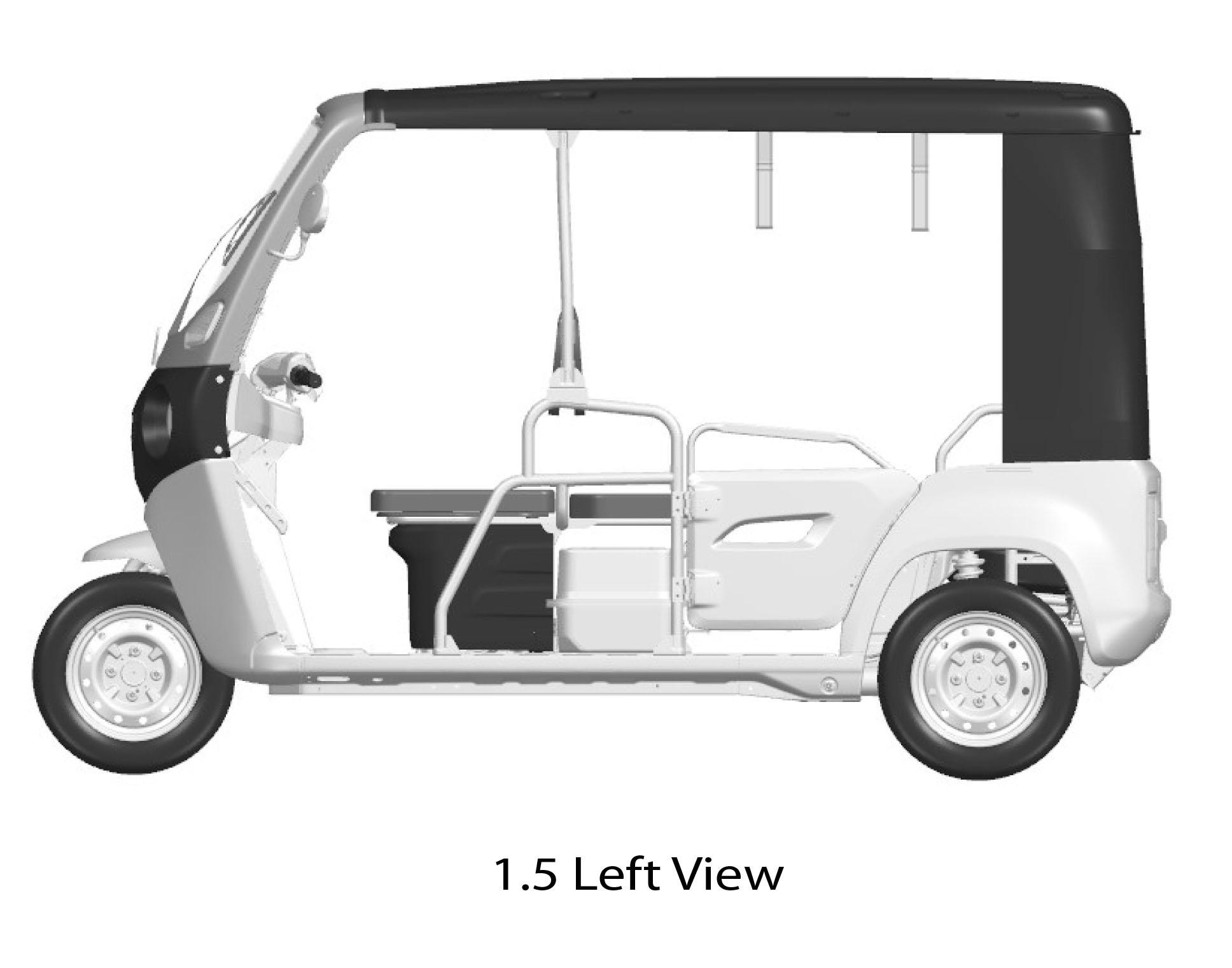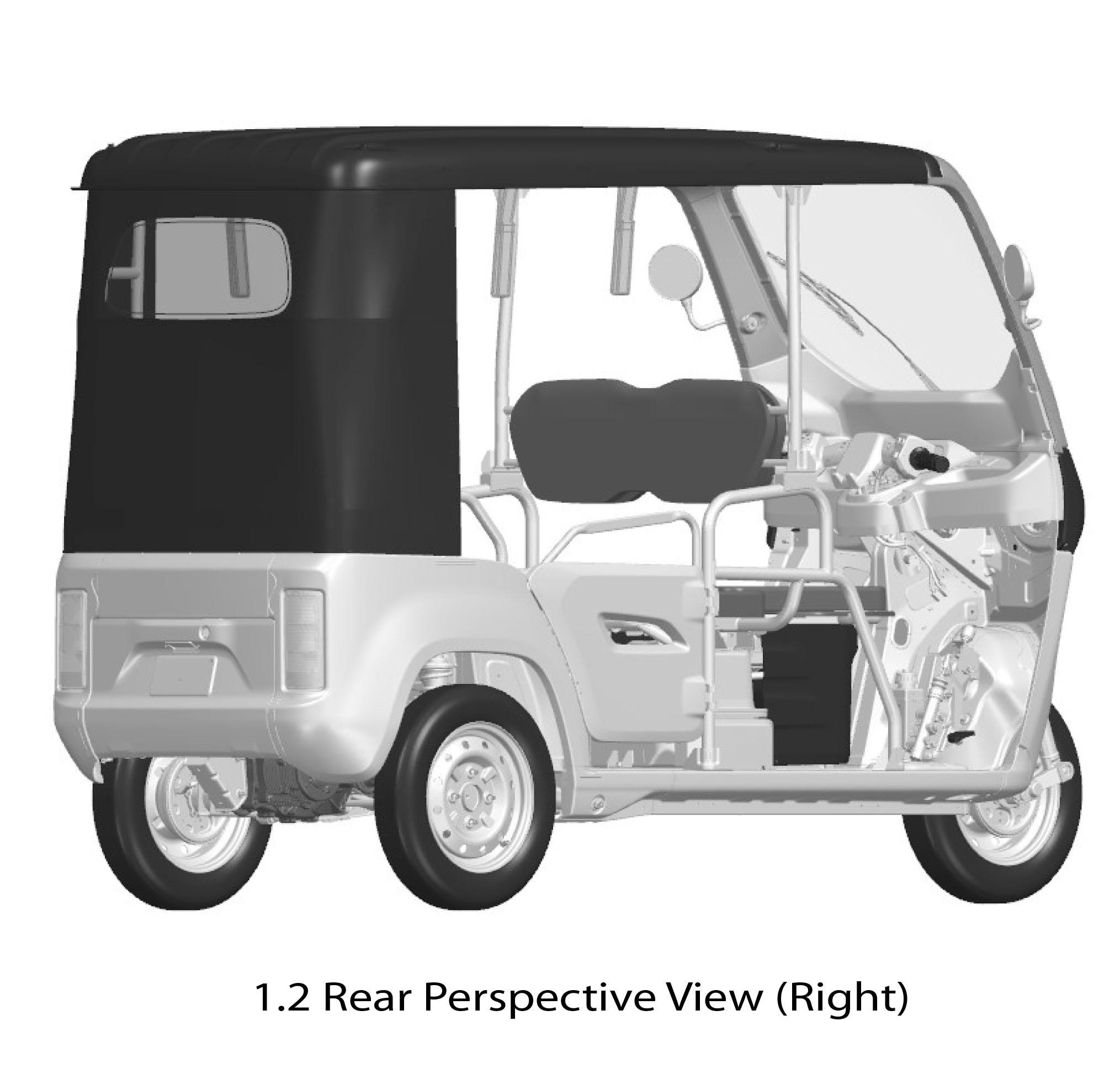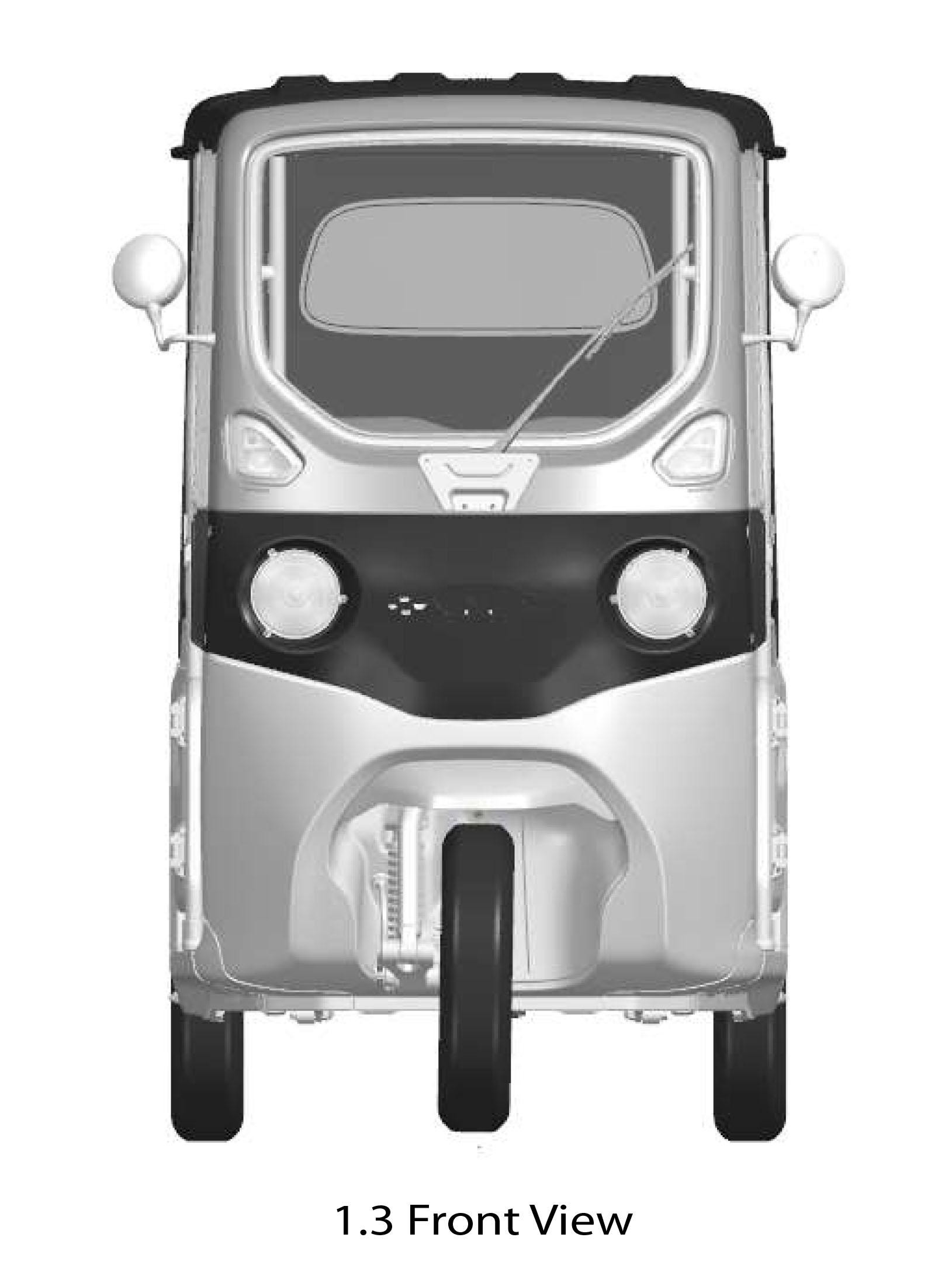 The automotive vehicle has a compact, symmetrical, urban-friendly design with a semi-enclosed body, flat canopy roof, dashboard integrating steering and control levers, and passenger cabin with lockable contoured doors. The front cowl houses dual round headlamps within a rectangular truncated panel. A large windscreen with angular corners enhances forward visibility. The canopy extends rearward to a transparent trapezoidal rear window. A single driver seat, dual rear bench seats, and tubular frame supports are provided. Tail lamps are integrated within rear panel. The automotive vehicle rides on one front wheel with leading arm suspension and two rear wheels.