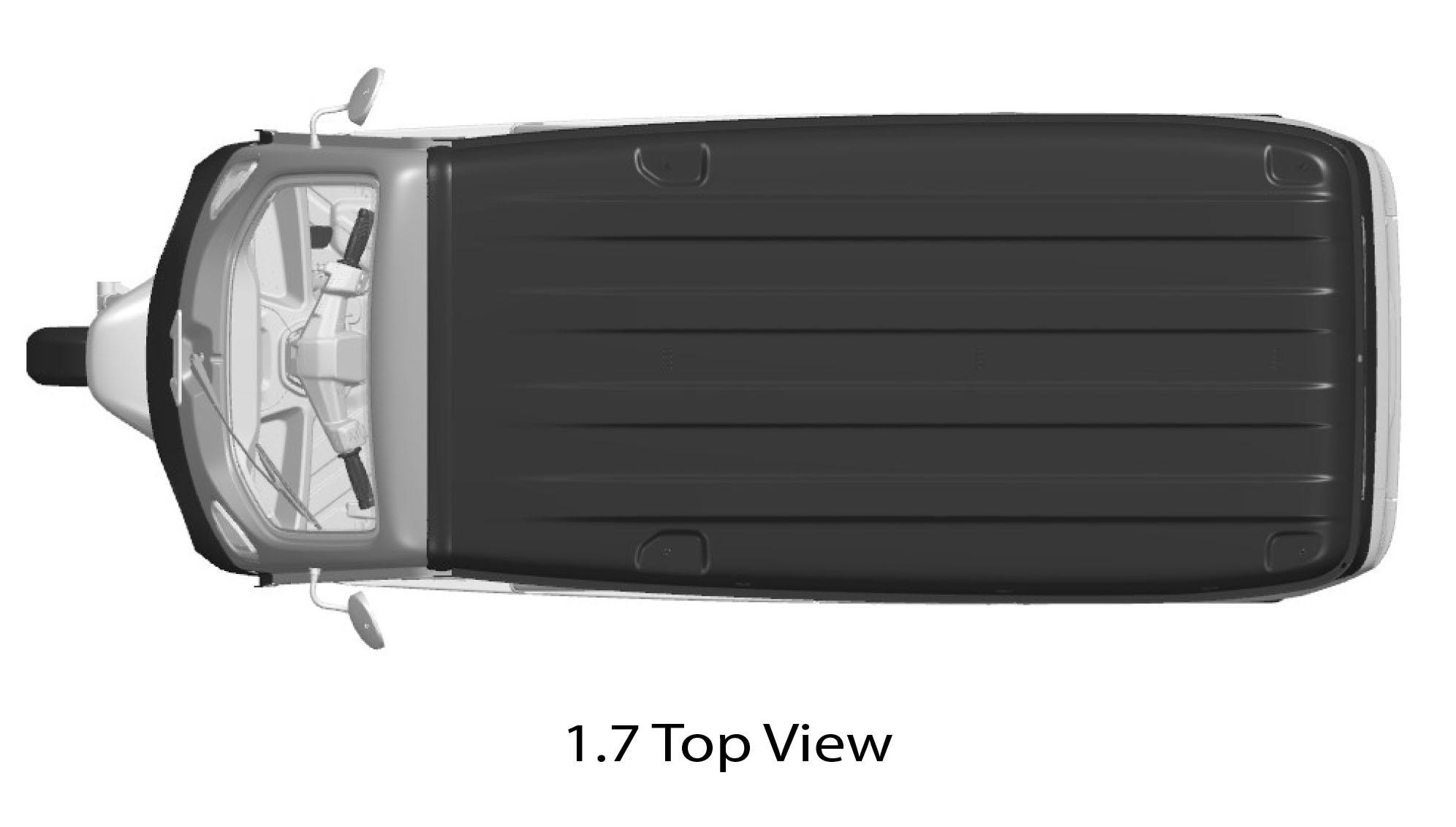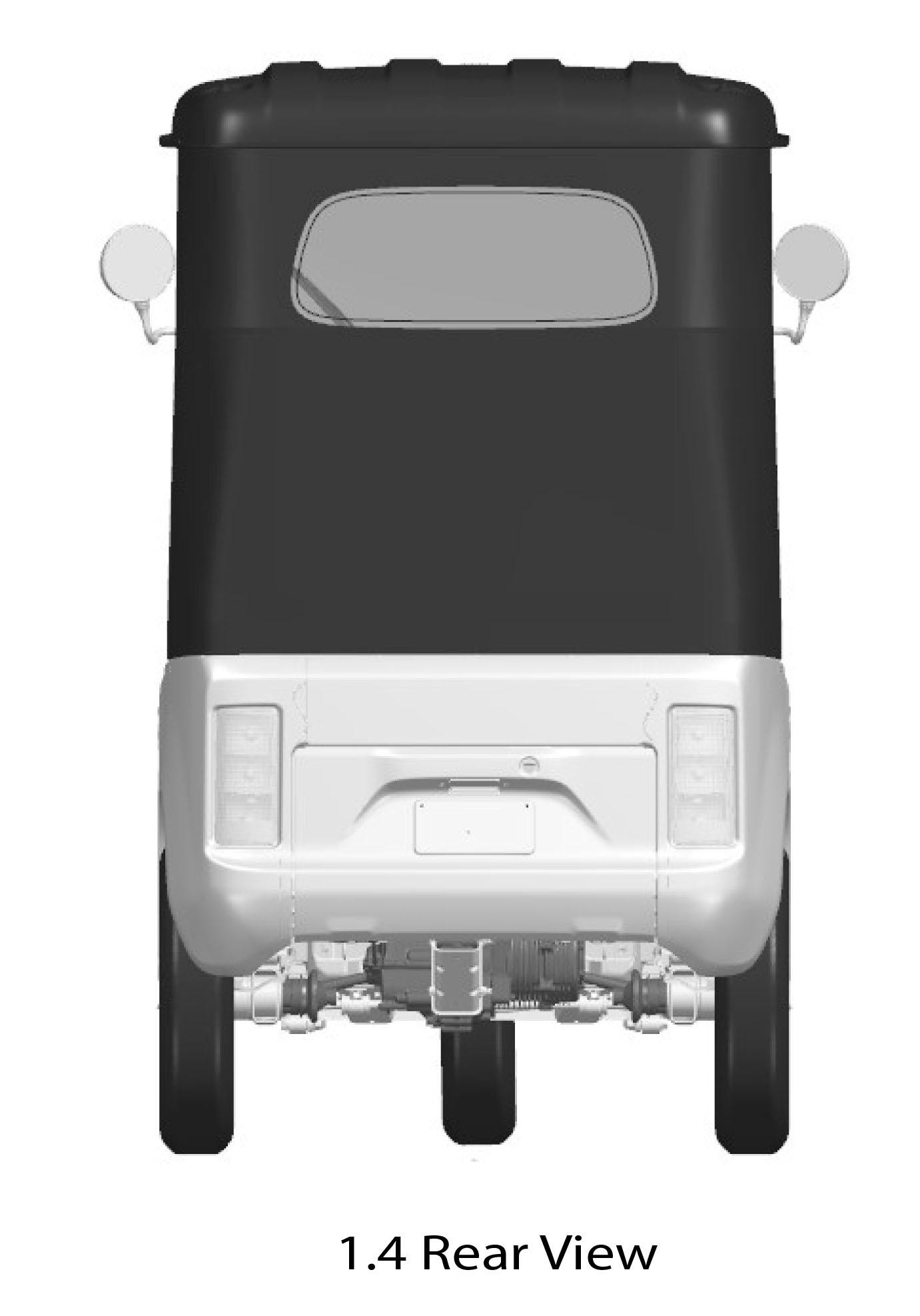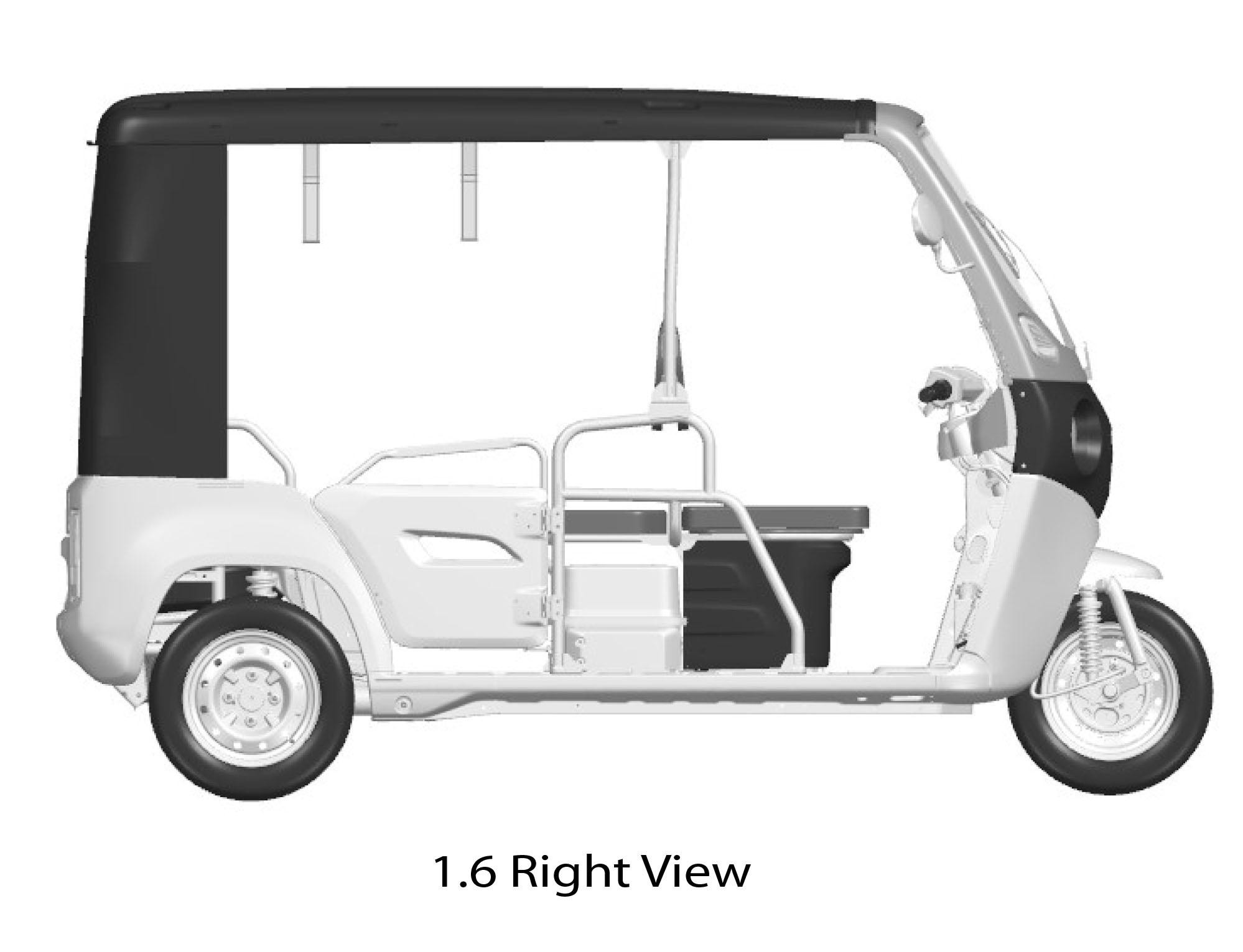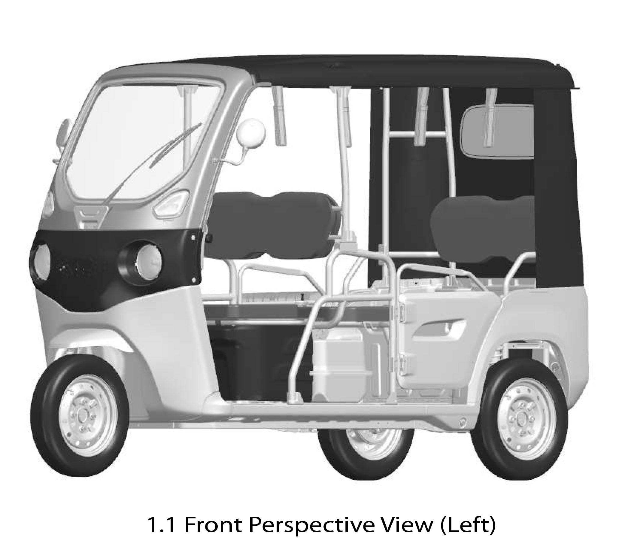 The automotive vehicle has a compact, symmetrical, urban-friendly design with a semi-enclosed body, flat canopy roof, dashboard integrating steering and control levers, and passenger cabin with lockable contoured doors. The front cowl houses dual round headlamps within a rectangular truncated panel. A large windscreen with angular corners enhances forward visibility. The canopy extends rearward to a transparent trapezoidal rear window. A single driver seat, dual rear bench seats, and tubular frame supports are provided. Tail lamps are integrated within rear panel. The automotive vehicle rides on one front wheel with leading arm suspension and two rear wheels.