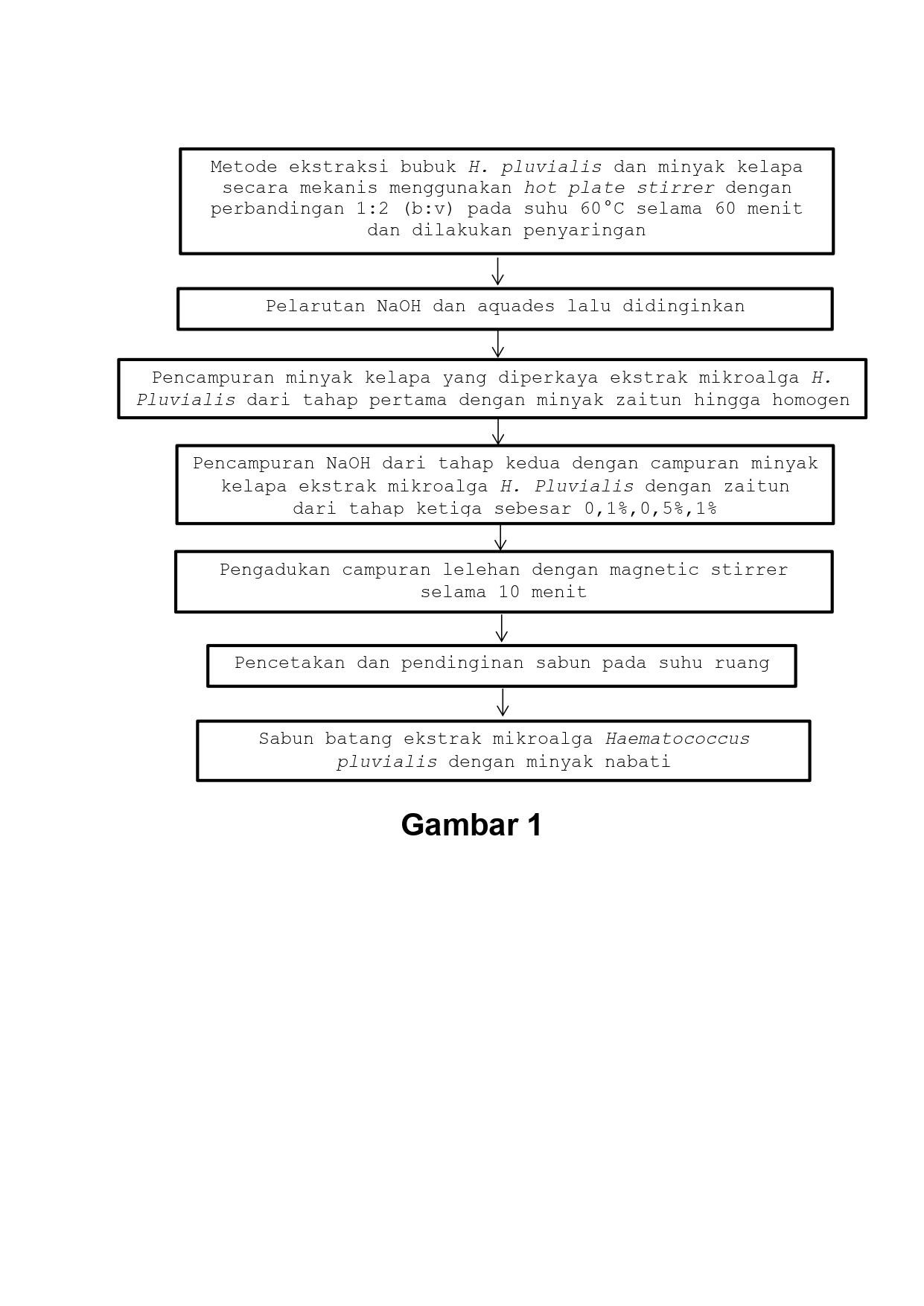 Invensi ini mengenai proses pembuatan sabun batang ekstrak mikroalga Haematococcus pluvialis dengan pelarut minyak nabati yang terdiri dari tahapan sebagai berikut: a. metode ekstraksi bubuk Haematococcus pluvialis dan minyak kelapa secara mekanis menggunakan hot plate stirrer dengan perbandingan bubuk Haematococcus pluvialis dengan minyak nabati 1:2 (b:v) pada suhu 60°C selama 60 menit, lalu maserasi 1 jam dan dilakukan penyaringan; b. pelarutan NaOH dan aquades lalu didinginkan; c. pencampuran minyak kelapa yang diperkaya dengan ekstrak mikroalga H. Pluvialis dari tahap a dengan minyak zaitun hingga homogen; d. pencampuran NaOH dari tahap b dan campuran minyak kelapa yang diperkaya dengan ekstrak mikroalga H. Pluvialis dengan minyak zaitun dari tahap c sebesar 0,1%,0,5%,1%; e. pengadukan campuran lelehan dari tahap d dengan magnetic stirrer selama 10 menit hingga trace; dan f. pencetakan dan pendinginan sabun pada suhu ruang hingga diperoleh sabun batang. Dengan adanya invensi ini maka tersedia proses pembuatan sabun batang ekstrak mikroalga Haematococcus pluvialis dengan pelarut minyak nabati dengan kandungan antioksidan mencapai 29,97%.