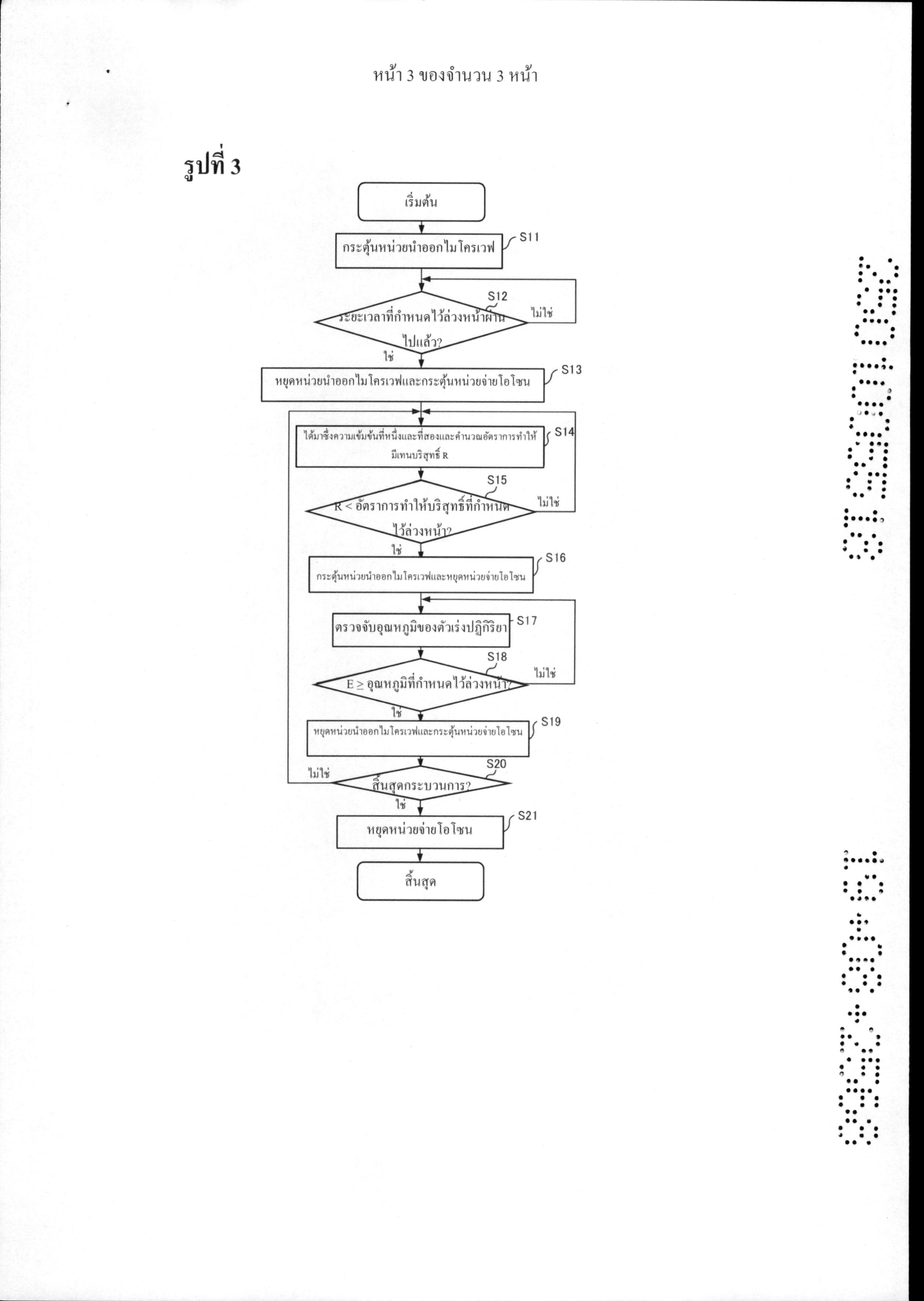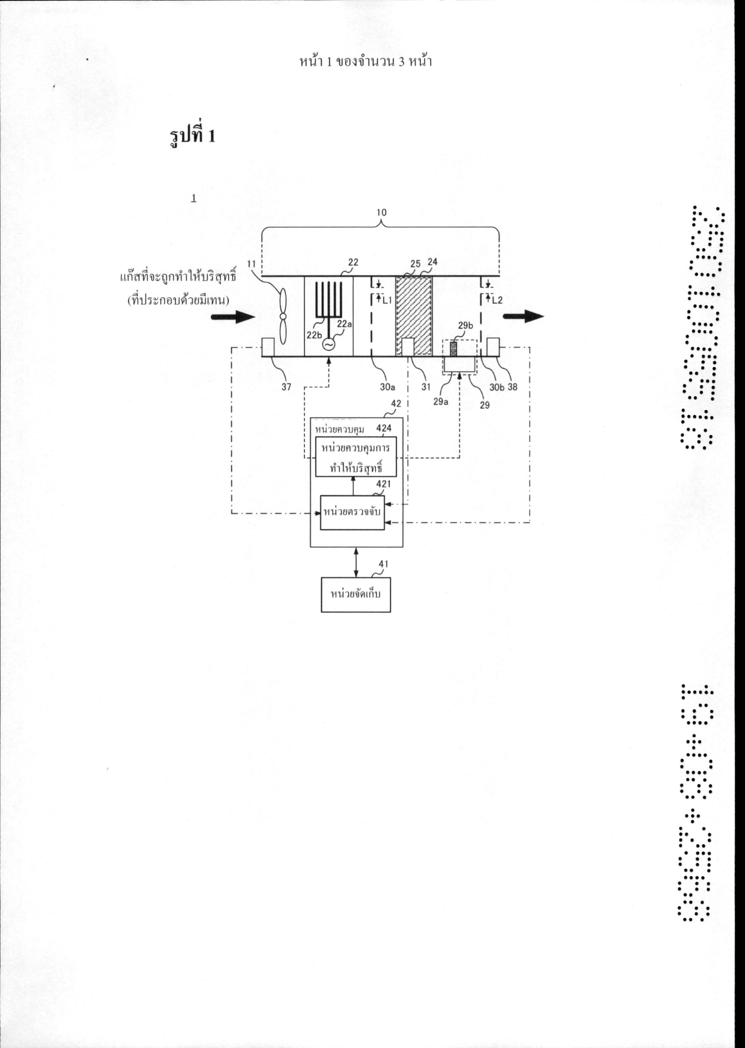 1 OCR 06WT 1. อุปกรณ์ทำให้มีเทนบริสุทธิ์ที่ประกอบรวมด้วย เส้นทางการไหลซึ่งแก๊สที่ประกอบด้วยมีเทนที่หนึ่งไหลผ่าน. หน่วยจ่ายโอโซนที่จ่ายโอโซนให้กับแก๊สที่หนึ่ง, ตัวเร่งปฏิกิริยาที่ย่อยสลายมีเทนที่อยู่ในแก๊สที่สองที่ประกอบด้วยแก๊สที่หนึ่งที่ไหลผ่าน เส้นทางการไหลและโอโซนที่ถูกจ่ายด้วยหน่วยจ่ายโอโซน และ หน่วยนำออกไมโครเวฟที่นำออกไมโครเวฟรอบตัวเร่งปฏิกิริยาในเส้นทางการไหล 2. อุปกรณ์ทำให้มีเทนบริสุทธิ์ตามข้อถือสิทธิที่ 1 ที่ประกอบรวมเพิ่มเติมด้วย แผ่นปกป้องที่หนึ่งที่ถูกจัดไว้ต้นทางของตัวเร่งปฏิกิริยาและหน่วยนำออกไมโครเวฟใน เส้นทางการไหล, รวมถึงส่วนผ่านที่หนึ่งหนึ่งส่วนหรือมากกว่านั้นซึ่งแก๊สที่สองไหลผ่าน และปิดกั้น ไมโครเวฟ และ แผ่นปกป้องที่สองที่ถูกจัดไว้ปลายทางของตัวเร่งปฏิกิริยาและหน่วยนำออกไมโครเวฟใน เส้นทางการไหล, รวมถึงส่วนผ่านที่สองหนึ่งส่วนหรือมากกว่านั้นซึ่งแก๊สที่สองไหลผ่าน และปิดกั้น ไมโครเวฟ 3. อุปกรณ์ทำให้มีเทนบริสุทธิ์ตามข้อถือสิทธิที่ 2, ที่ซึ่งแผ่นปกป้องที่หนึ่งรวมถึงส่วน ผ่านที่หนึ่งที่มีความยาวด้านข้างหรือเส้นผ่านศูนย์กลางที่เท่ากับครึ่งหนึ่งหรือน้อยกว่านั้นของความ ยาวคลื่นของไมโครเวฟที่ถูกนำออกด้วยหน่วยนำออกไมโครเวฟ และ แผ่นปกป้องที่สองรวมถึงส่วนผ่านที่สองที่มีความยาวด้านข้างหรือเส้นผ่านศูนย์กลางที่เท่ากับ หรือน้อยกว่าครึ่งหนึ่งของความยาวคลื่นของไมโครเวฟที่ถูกนำออกด้วยหน่วยนำออกไมโครเวฟ 4. อุปกรณ์ทำให้มีเทนบริสุทธิ์ตามข้อใดข้อหนึ่งในข้อถือถือสิทธิที่ 1 ถึง 3 ที่ประกอบรวม เพิ่มเติมด้วย หน่วยควบคุมการทำให้บริสุทธิ์ที่ควบคุมระยะเวลาที่หน่วยจ่ายโอโซนจ่ายโอโซนและ ระยะเวลาที่หน่วยนำออกไมโครเวฟนำออกไมโครเวฟ 5. อุปกรณ์ทำให้มีเทนบริสุทธิ์ ทำให้หน่วยนำออกไมโครเวฟนำออกไมโครเวฟทันทีหลังจากชุดอุปกรณ์ทำให้มีเทนบริสุทธิ์ถูก กระตุ้น และทำให้หน่วยจ่ายโอโซนจ่ายโอโซนหลังจากระยะเวลาที่กำหนดไว้ล่วงหน้าผ่านไปตั้งแต่ เวลาที่หน่วยนำออกไมโครเวฟเริ่มนำออกไมโครเวฟ 6. อุปกรณ์ทำให้มีแทนบริสุทธิ์ตามข้อถือถือสิทธิที่ 4 หรือ 5 ที่ประกอบรวมเพิ่มเติมด้วย หน่วยตรวจจับที่ตรวจจับความเข้มข้นที่หนึ่งของมีเทนที่อยู่ในแก๊สที่หนึ่งที่ช่องเข้าของ เส้นทางการไหลและความเข้มข้นที่สองของมีเทนที่อยู่ในแก๊สที่สองที่ไหลที่ปลายทางของตัวเร่ง ปฏิกิริยาในเส้นทางการไหล, ที่ซึ่งหน่วยควบคุมการทำให้บริสุทธิ์ทำให้หน่วยนำออกไมโครเวฟนำ ออกไมโครเวฟภายได้เงื่อนไขว่า (i) อัตราการ