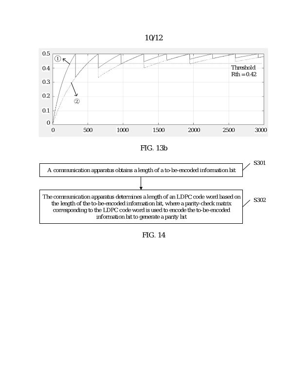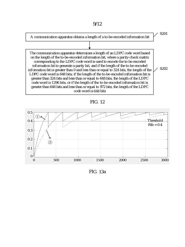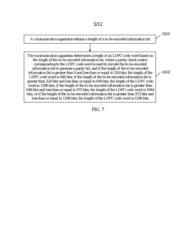 (EN) METHOD FOR DETERMINING LENGTH OF LDPC CODE WORD IN UWB SYSTEM AND RELATED APPARATUS ABSTRACT This application relates to a method for determining a length of an LDPC code word in a 5 UWB system and a related apparatus. The method includes: A communication apparatus determines a length of an LDPC code based on a length of a to-be-encoded information bit. When the length of the information bit ranges from 0 to 324, a 648-bit LDPC code is selected. When the length of the information bit ranges from 325 to 648 or from 973 to 1296, a 1296-bit LDPC code is selected. When the length of the information bit ranges from 649 to 972, a 1944-bit LDPC code 10 is selected. According to embodiments of this application, higher performance gain can be achieved. This application is applied to a UWB-based wireless personal local area network system, sensing system, or the like, including an 802.15 series protocol, such as the 802.15.4ab protocol or a next-generation UWB protocol of the 802.15.4ab protocol; and may be further applied to a wireless local area network system based on an 802.11 series protocol, such as 802.11be or a next-15 generation protocol of 802.11be, or Wi-Fi 8. FIG. 7 68