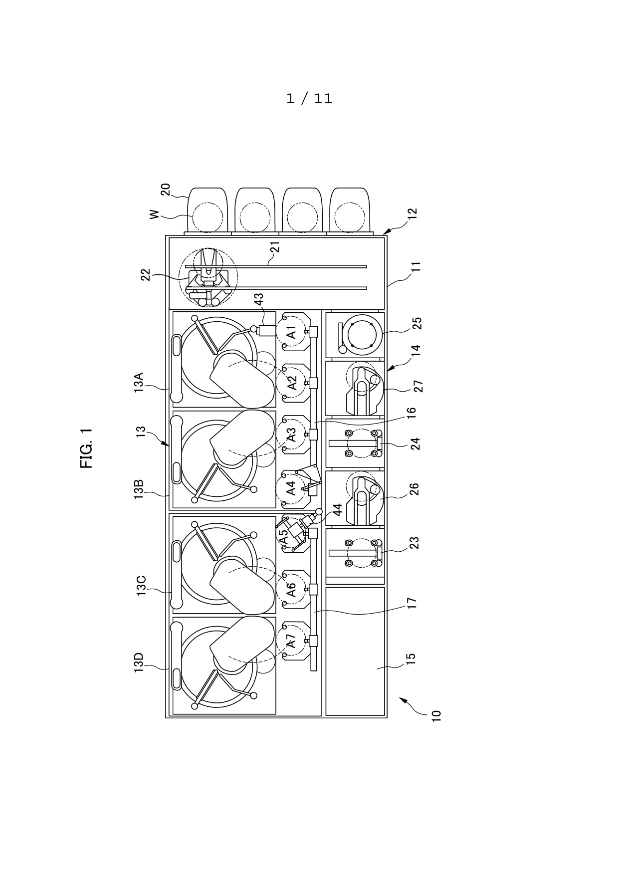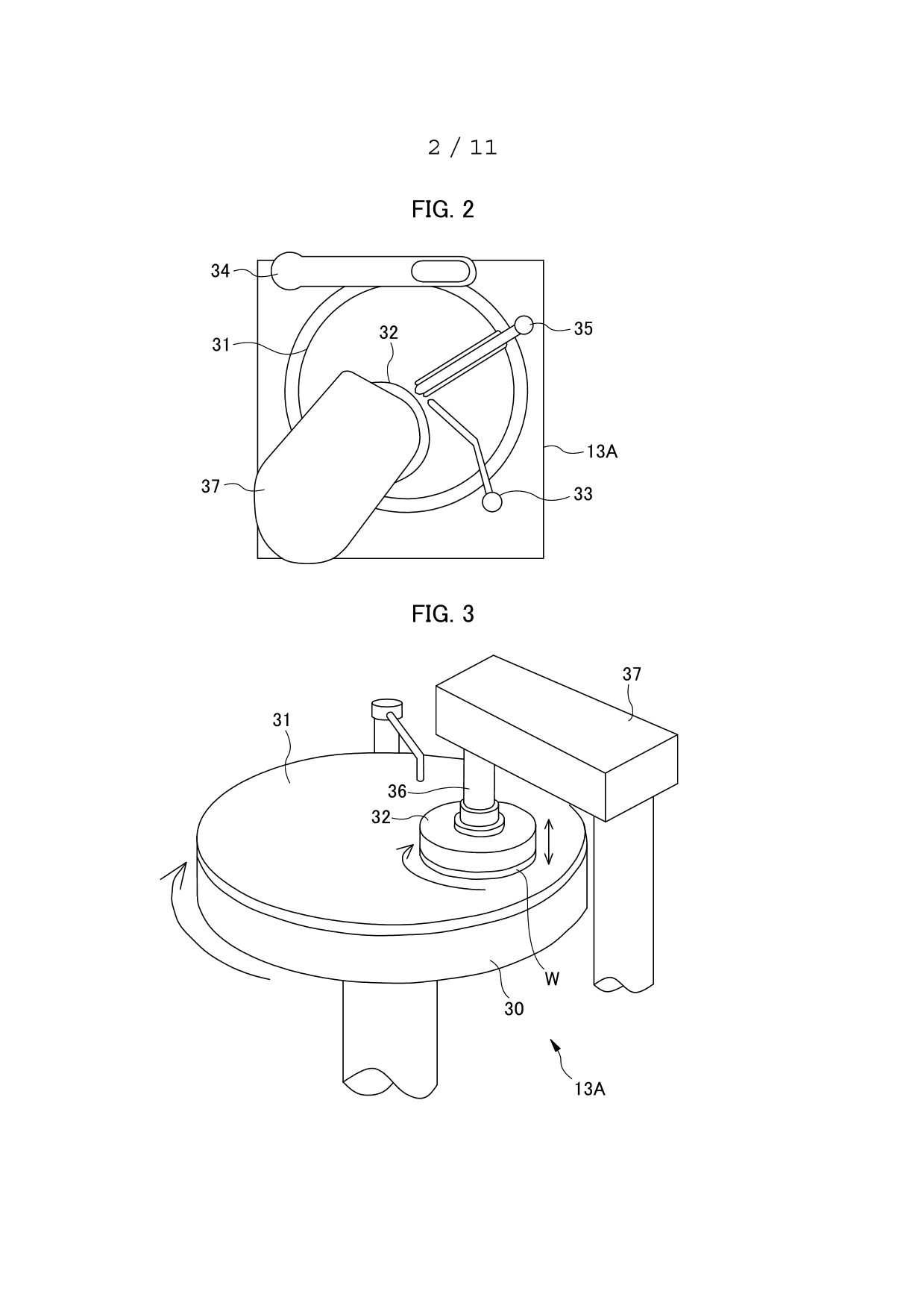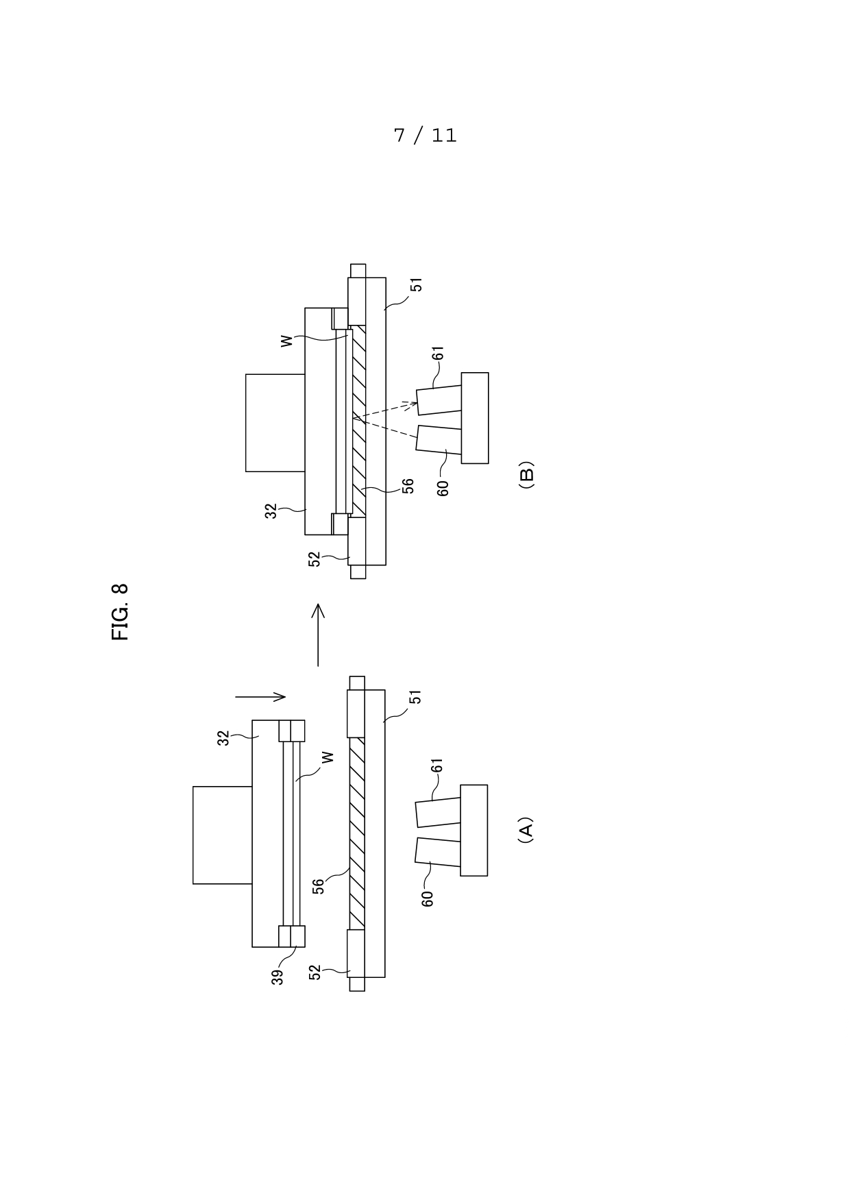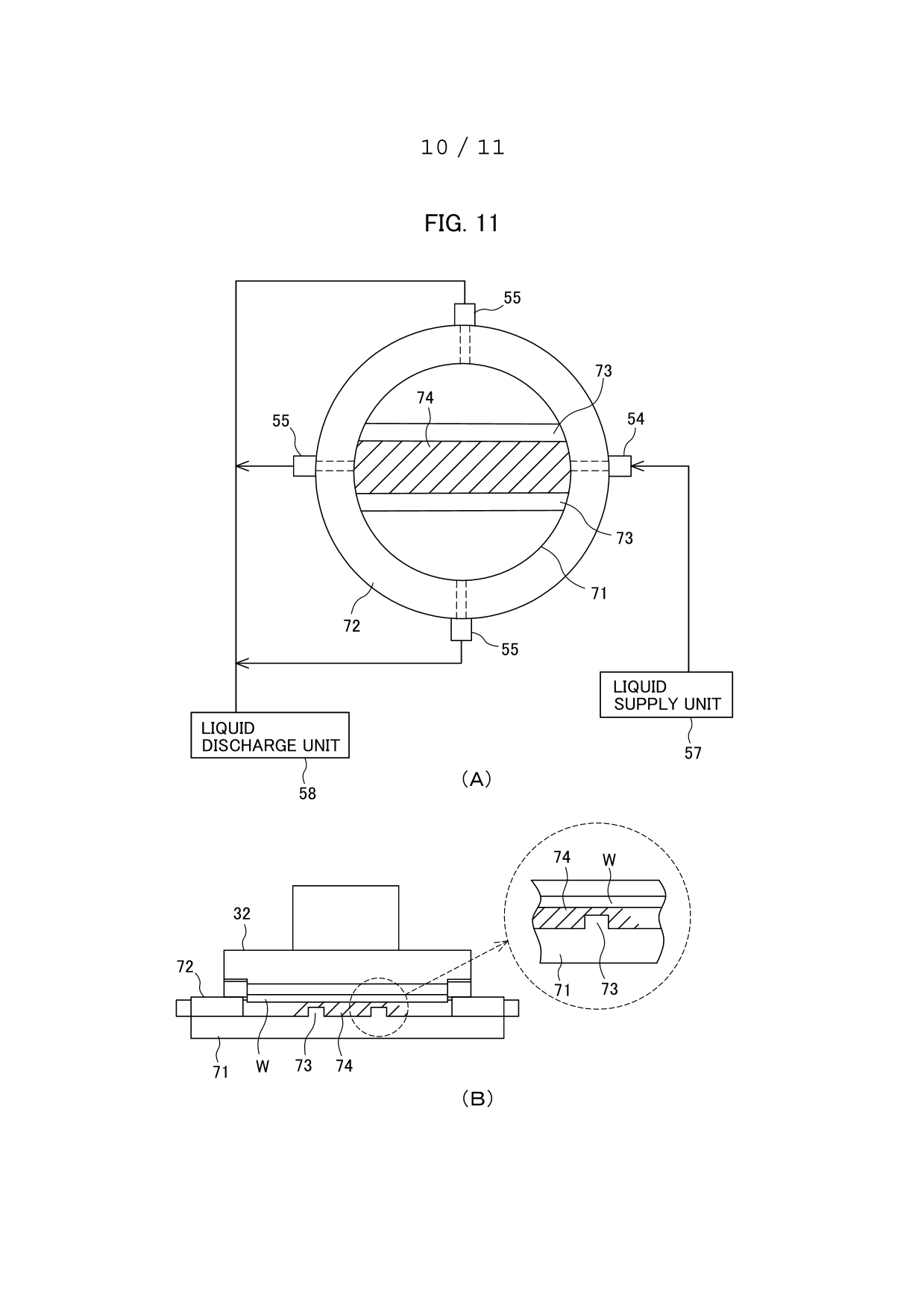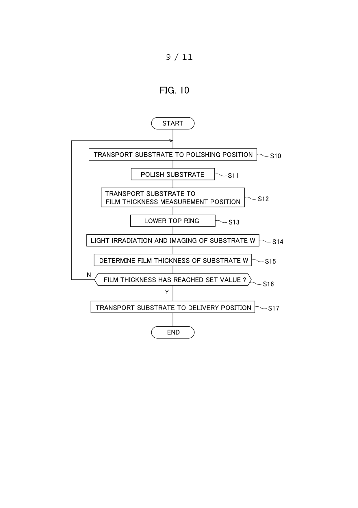 (EN) ABSTRACT Provided is a film thickness measurement device, including: a head that holds a substrate to be polished and is capable of moving the substrate, a stage made of transparent material; a liquid supply unit configured to supply liquid onto the stage; a liquid discharge unit configured to discharge the liquid on the stage to the outside; a measurement unit configured to be placed on a side opposite to the head across the stage and to optically measure a film thickness on a surface of the substrate that is placed across the stage; and a control unit configured to move at least one of the stage and the head toward the other, and to irradiate the substrate with light while the surface of the substrate is immersed in the liquid, thereby performing film thickness measurement. Fig. 8 34