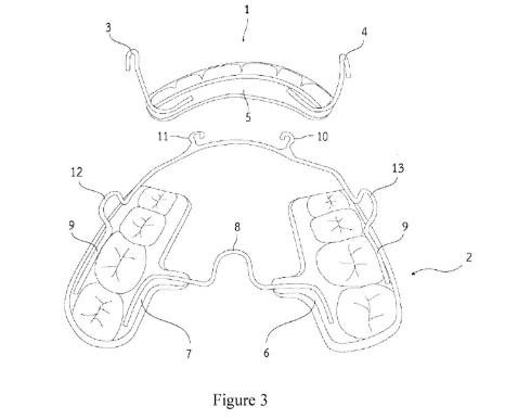 and the second hook (4) attached to the upper plate (5) of the first appliance, and the second appliance (2) that comprises the right plate (6) and the left plate (7) covering all the upper posterior teeth, with the first wire (8) attached to the right plate (6) and the left plate (7), and with the second wire (9) that is a stainless steel spring hard wire at the premolars made into