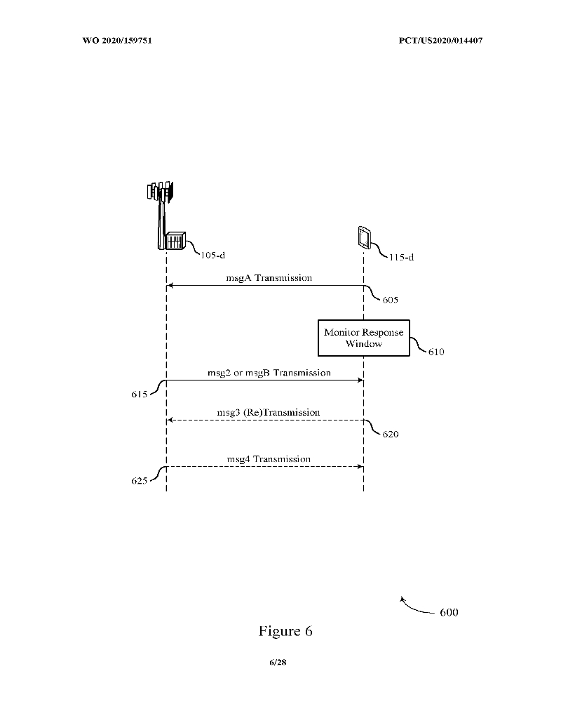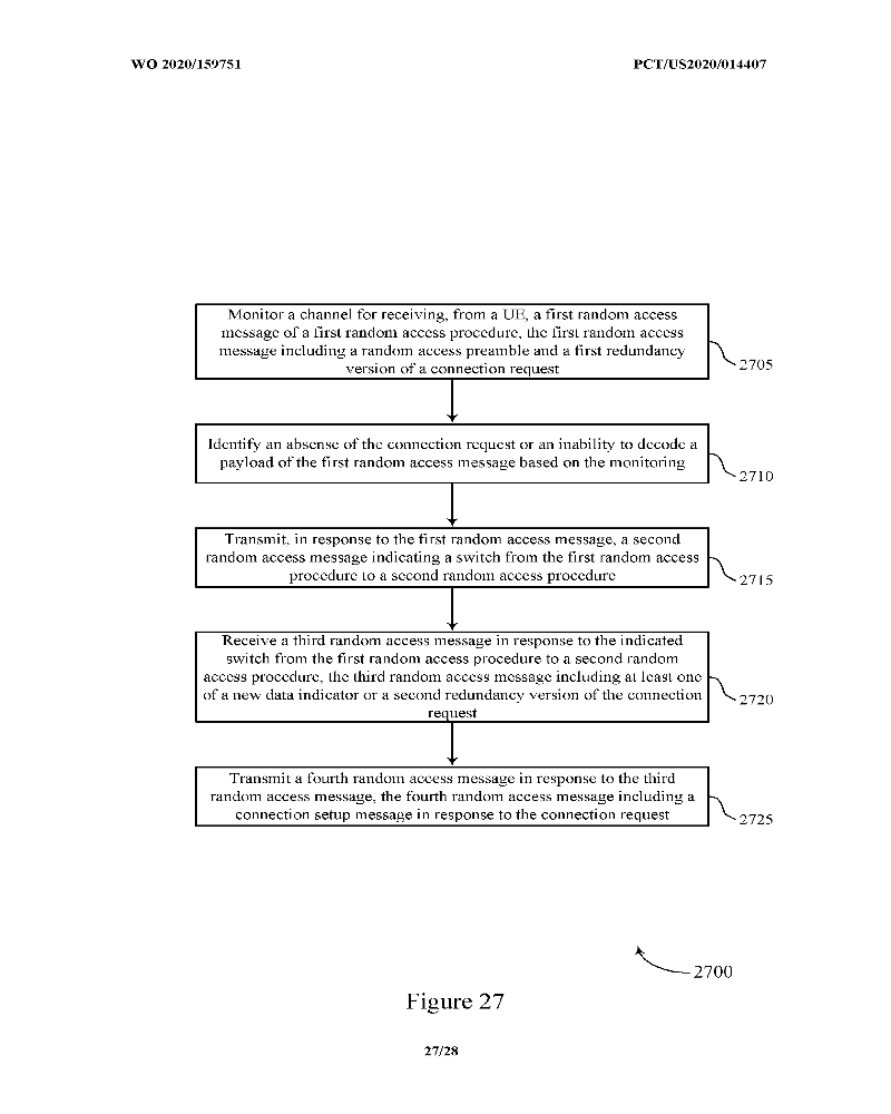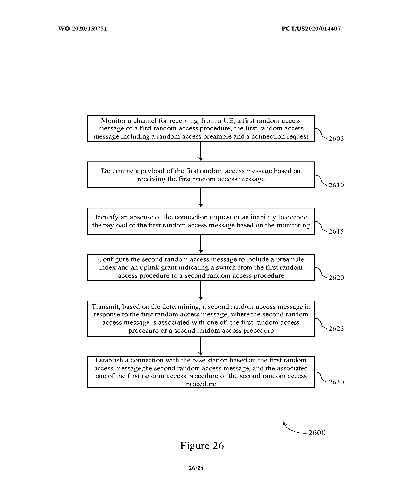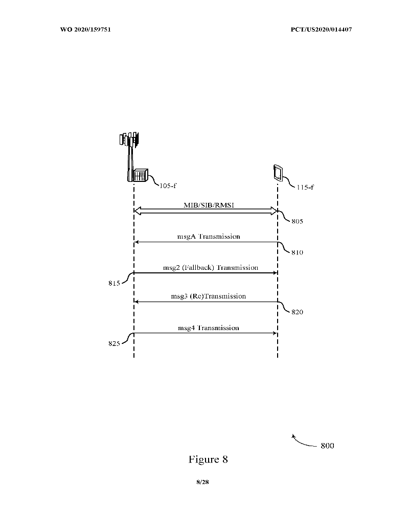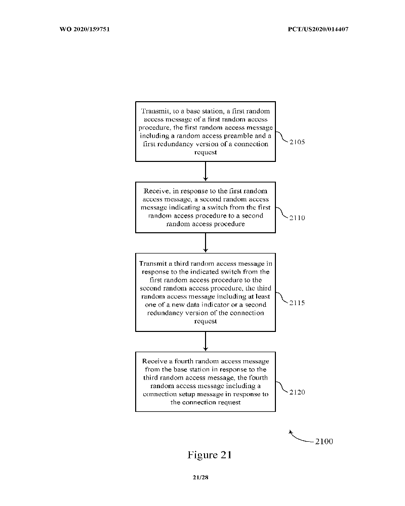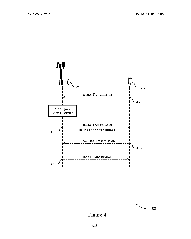 (EN) ABSTRACT RANDOM ACCESS PROCEDURE FALLBACK This disclosure provides systems, methods and apparatus for wireless communications that support fallback from a 2-step to a 4-step random access procedures. A user equipment (UE) may establish a connection with a base station using a random access procedure. The random access procedure may be a 2-step random access procedure and reduce a number of handover exchange messages. The 2-step random access procedure may include the UE transmitting, to the base station, a first random access message including a preamble and a payload. In some implementations, the base station may receive the preamble but fail to receive or decode the payload. The random access procedure may utilize the received preamble information instead of performing retransmission of the first random access message. The base station may transmit a second random access message to the UE indicating, explicitly or implicitly, a fallback to a 4-step random access procedure for connection establishment. Fig. 4 127