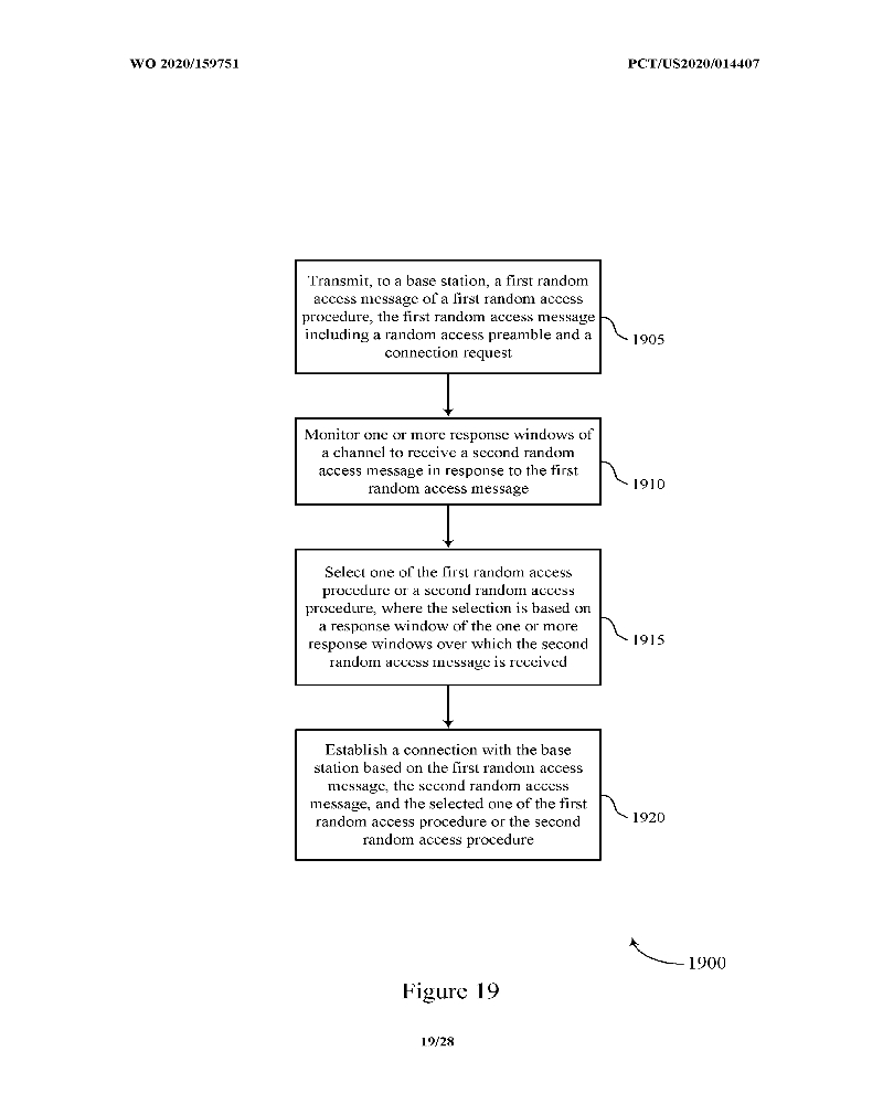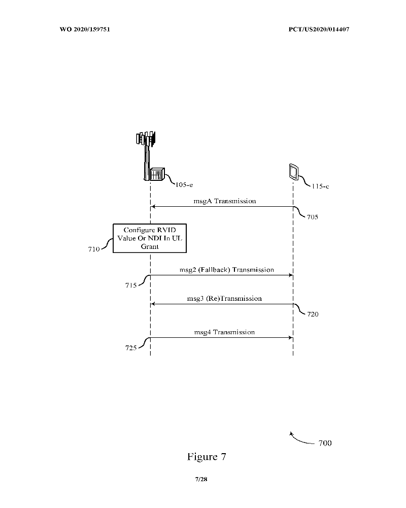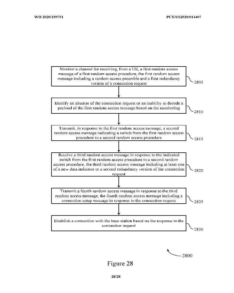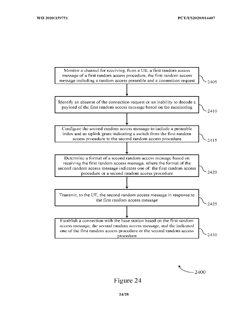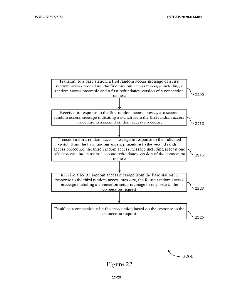 (EN) ABSTRACT RANDOM ACCESS PROCEDURE FALLBACK This disclosure provides systems, methods and apparatus for wireless communications that support fallback from a 2-step to a 4-step random access procedures. A user equipment (UE) may establish a connection with a base station using a random access procedure. The random access procedure may be a 2-step random access procedure and reduce a number of handover exchange messages. The 2-step random access procedure may include the UE transmitting, to the base station, a first random access message including a preamble and a payload. In some implementations, the base station may receive the preamble but fail to receive or decode the payload. The random access procedure may utilize the received preamble information instead of performing retransmission of the first random access message. The base station may transmit a second random access message to the UE indicating, explicitly or implicitly, a fallback to a 4-step random access procedure for connection establishment. Fig. 4 127