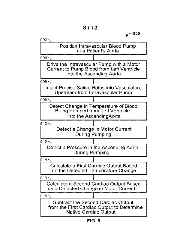 (EN) SYSTEM AND METHOD FOR DETERMINING NATIVE CARDIAC OUTPUT WHILE CONTINUING SUPPORT TO THE HEART WITH A CATHETER- MOUNTED INTRACARDIAC BLOOD PUMP HAVING AN IMBEDDED THERMISTOR Abstract [74] A system and method for determining native cardiac output of a heart while maintaining operation of an intracardiac blood pump includes determining a current drawn by the pump motor, a blood pressure within the ascending aorta, and a change in the blood temperature based on a thermodilution technique. An intracardiac blood pump positioned in the aorta includes at least one sensor for determining a motor current and blood pressure and a thermistor for determining the change in blood temperature after a precise fluid bolus has been introduced into the vasculature. A processor receives current, pressure, and temperature measurements, and calculates a pump flow output and a total cardiac output from which the native cardiac output is calculated. The native cardiac output and other clinically relevant variables derived from the measurements inform decisions related to continued therapeutic care, including increasing or decreasing cardiac assistance provided by the intracardiac pump. [Fig. 3] - 33 -