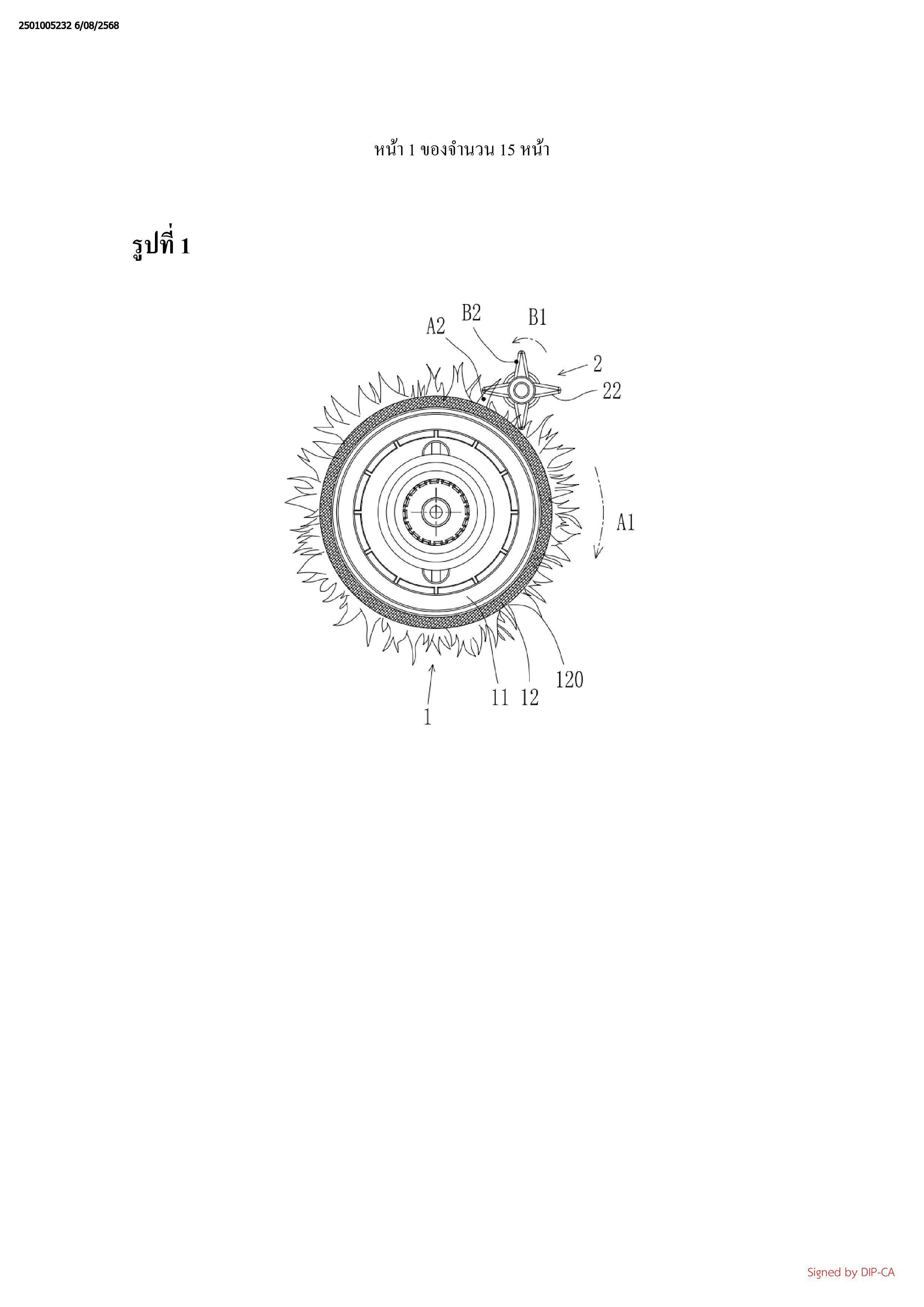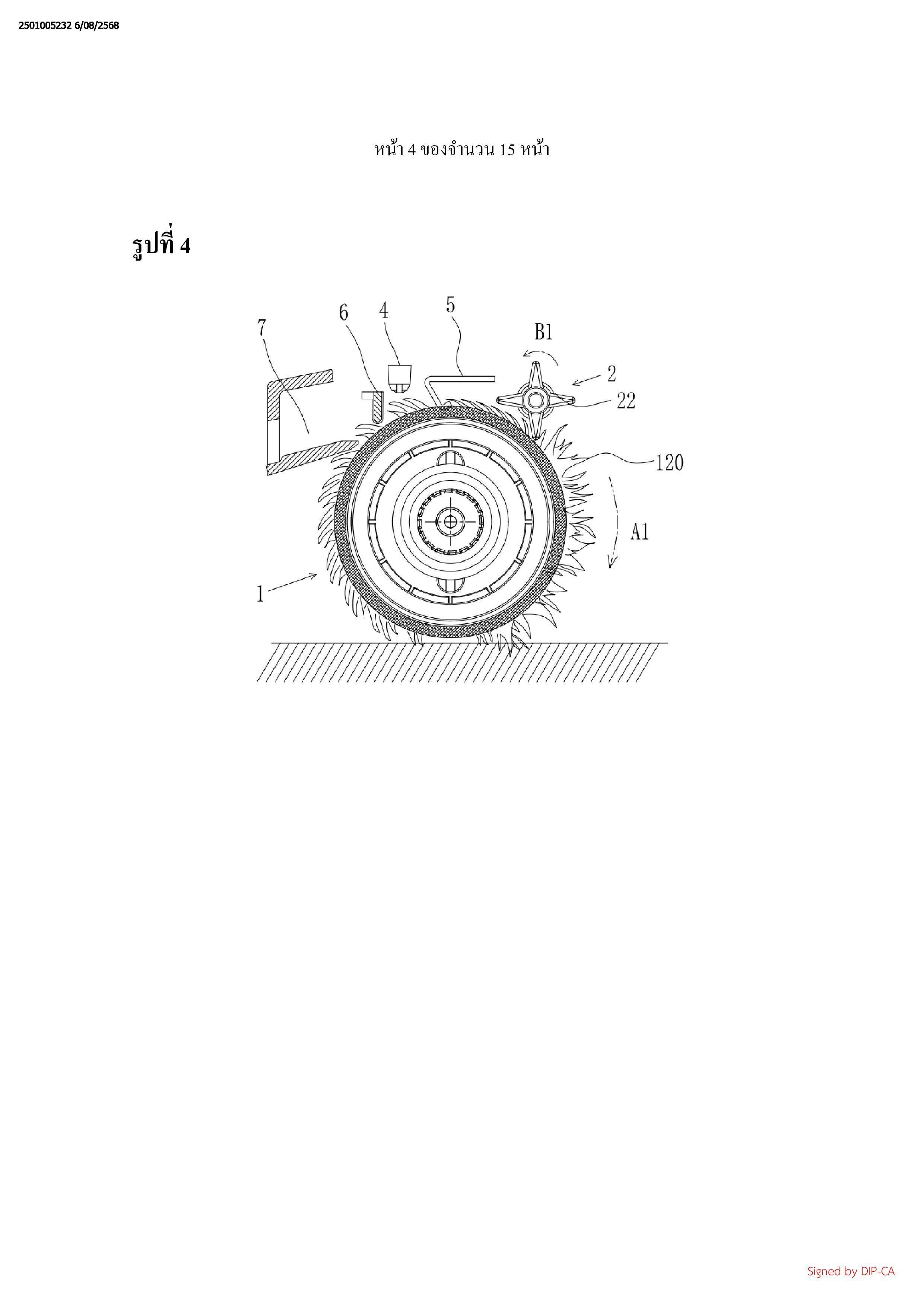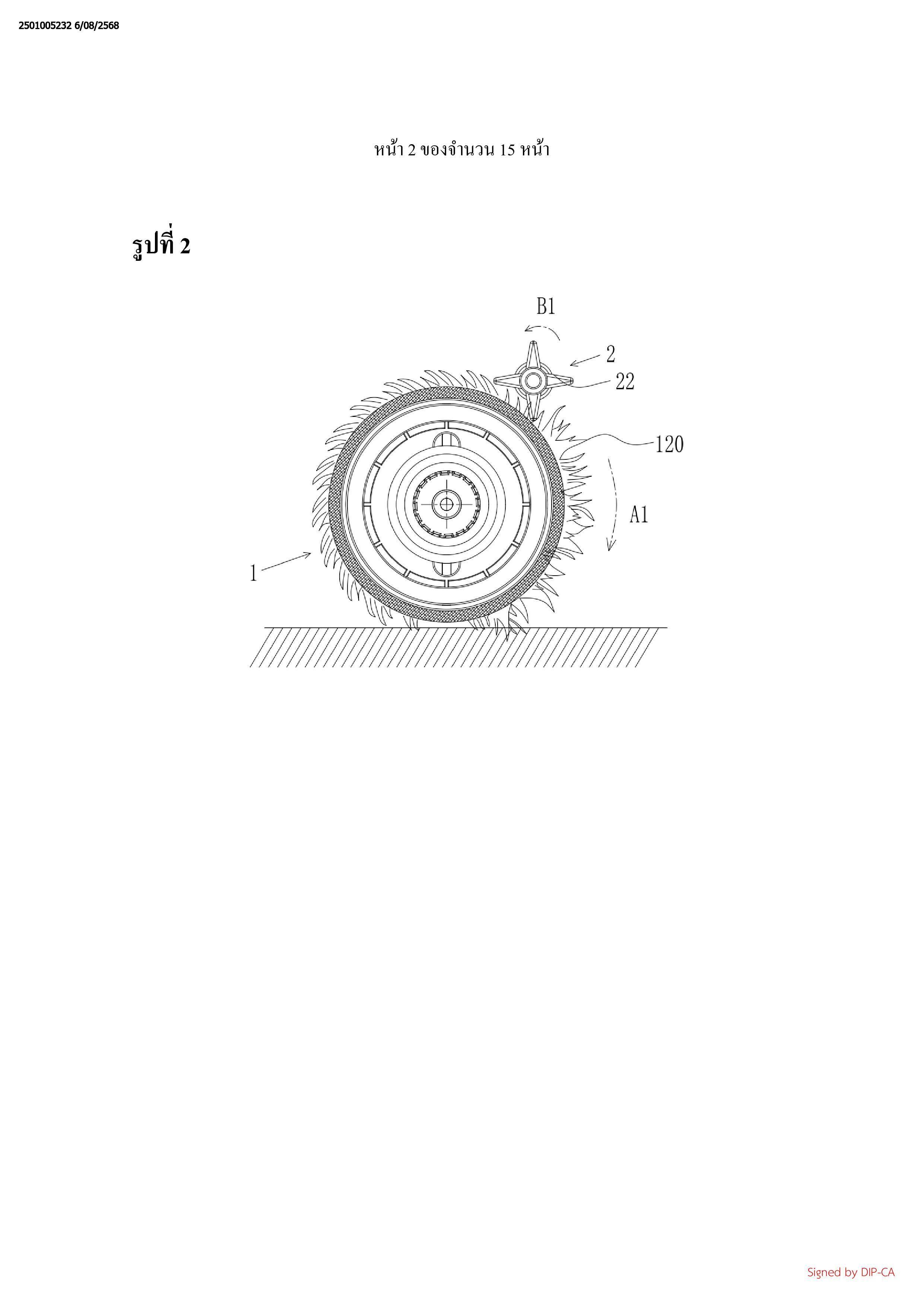 ทางการหมุนของหัวถูพื้นแบบลูกกลิ้ง (1), และอัตราเร็วตามเส้นรอบวงของฟันที่ยื่นออก (22) ของ