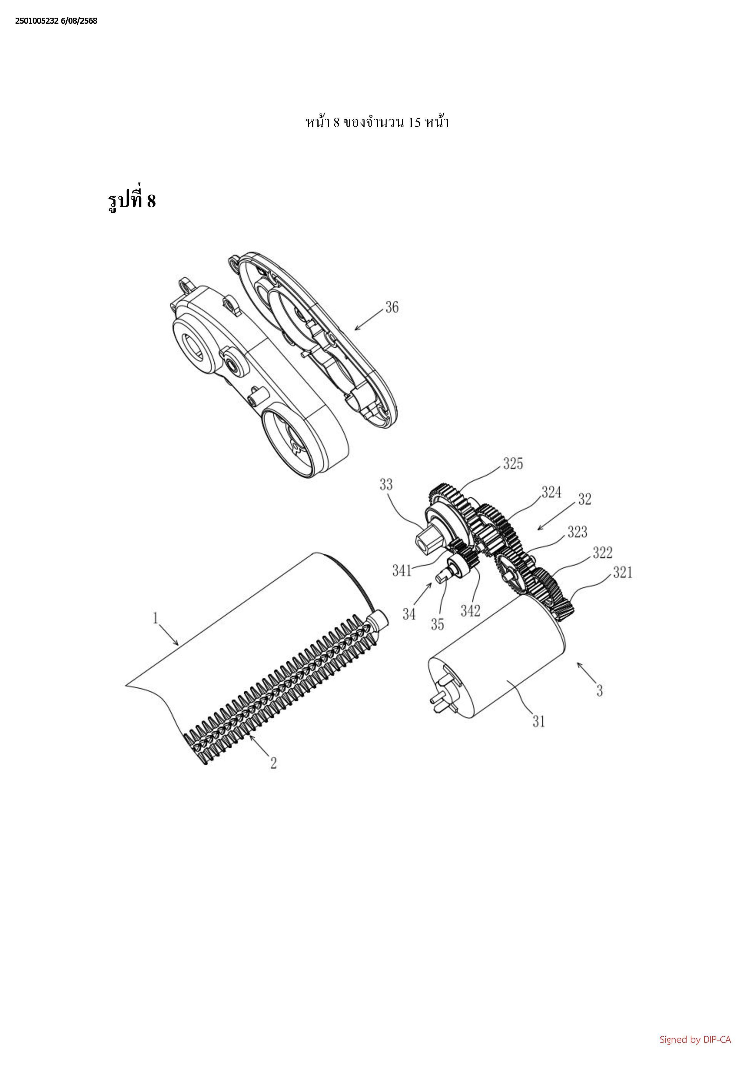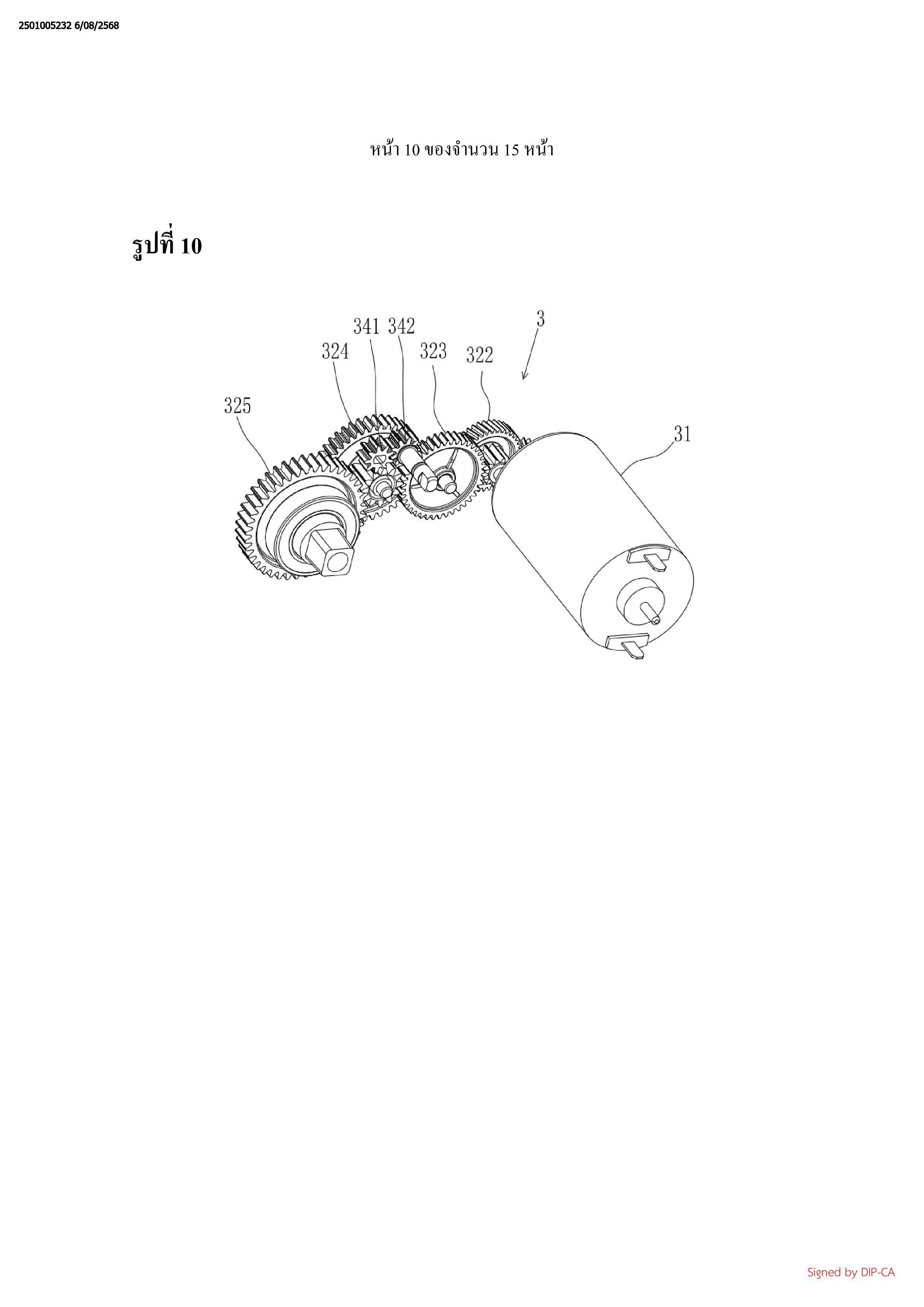 รวมด้วยมอเตอร์ (31), ชุดเฟืองที่หนึ่ง (32), และชุดเฟืองที่สอง (34);