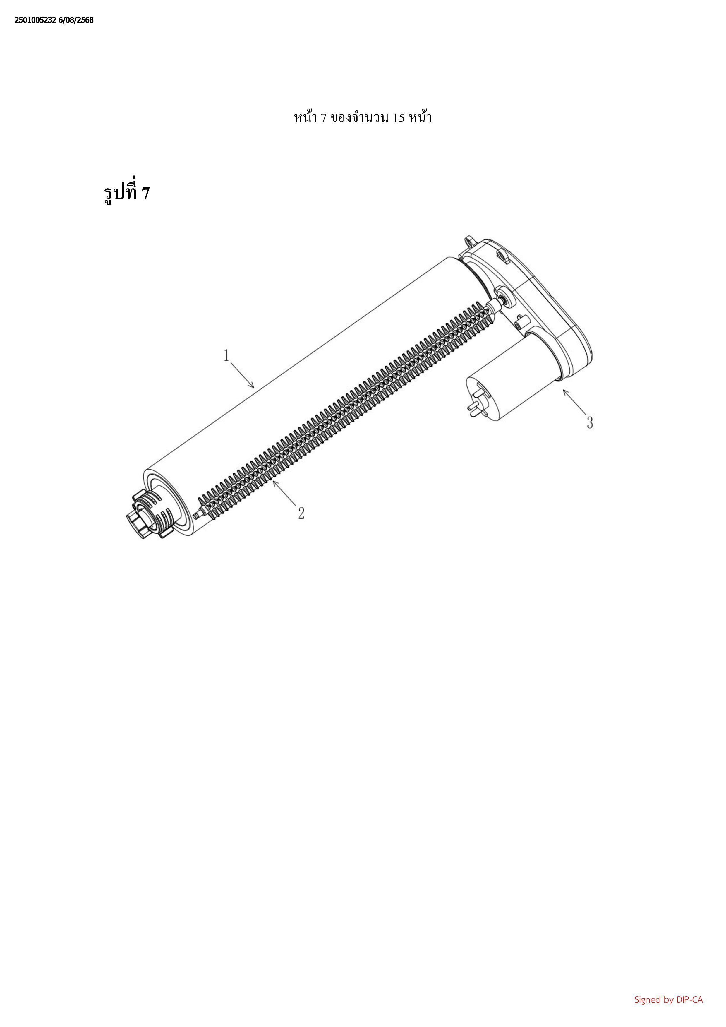 ถังรวบรวมน้ำ (7), ฟันหวี (6), หัวพ่นน้ำ (4), ใบรีดน้ำ (5), และแท่งทำให้ฟู (2) ถูกจัดเตรียม