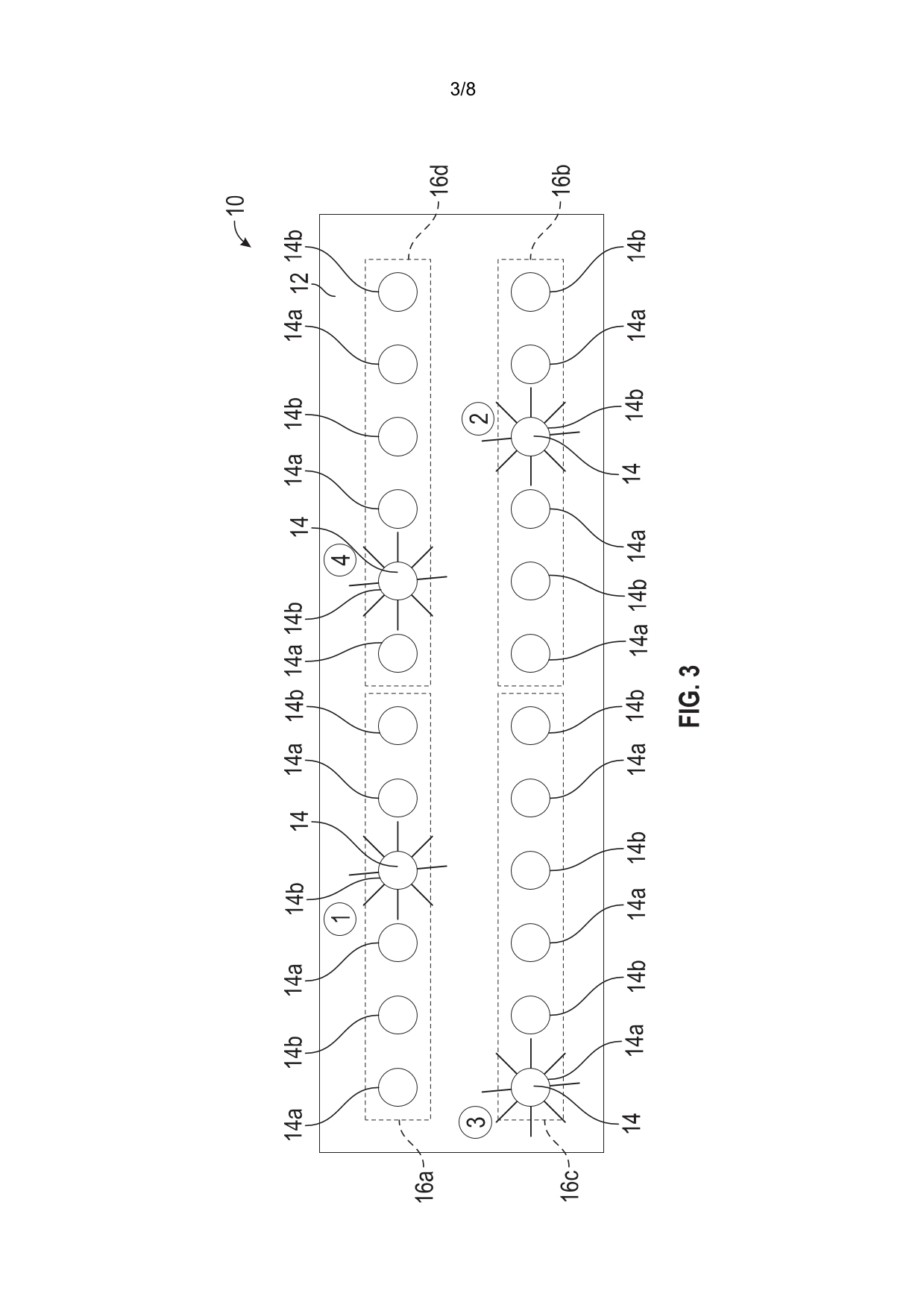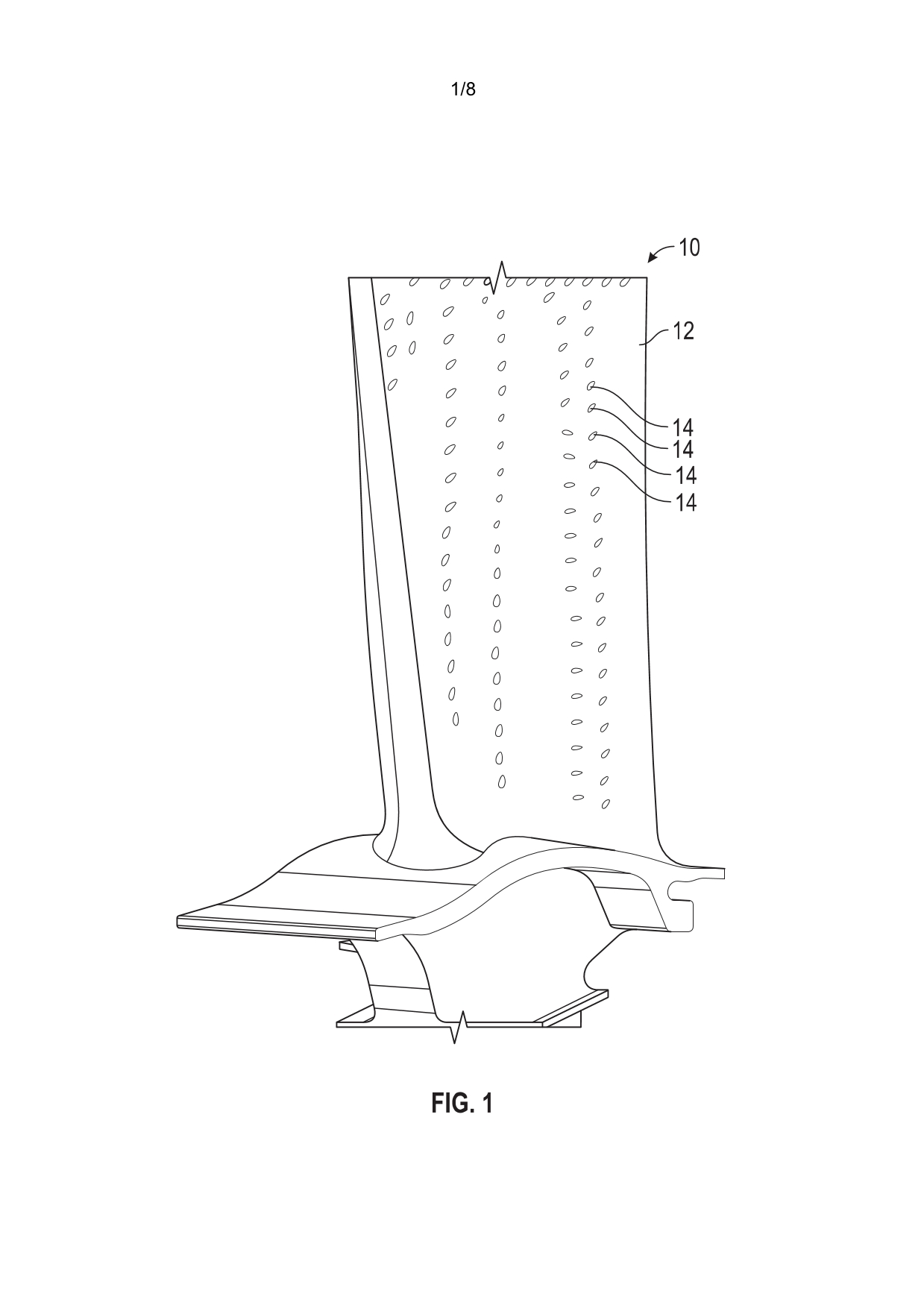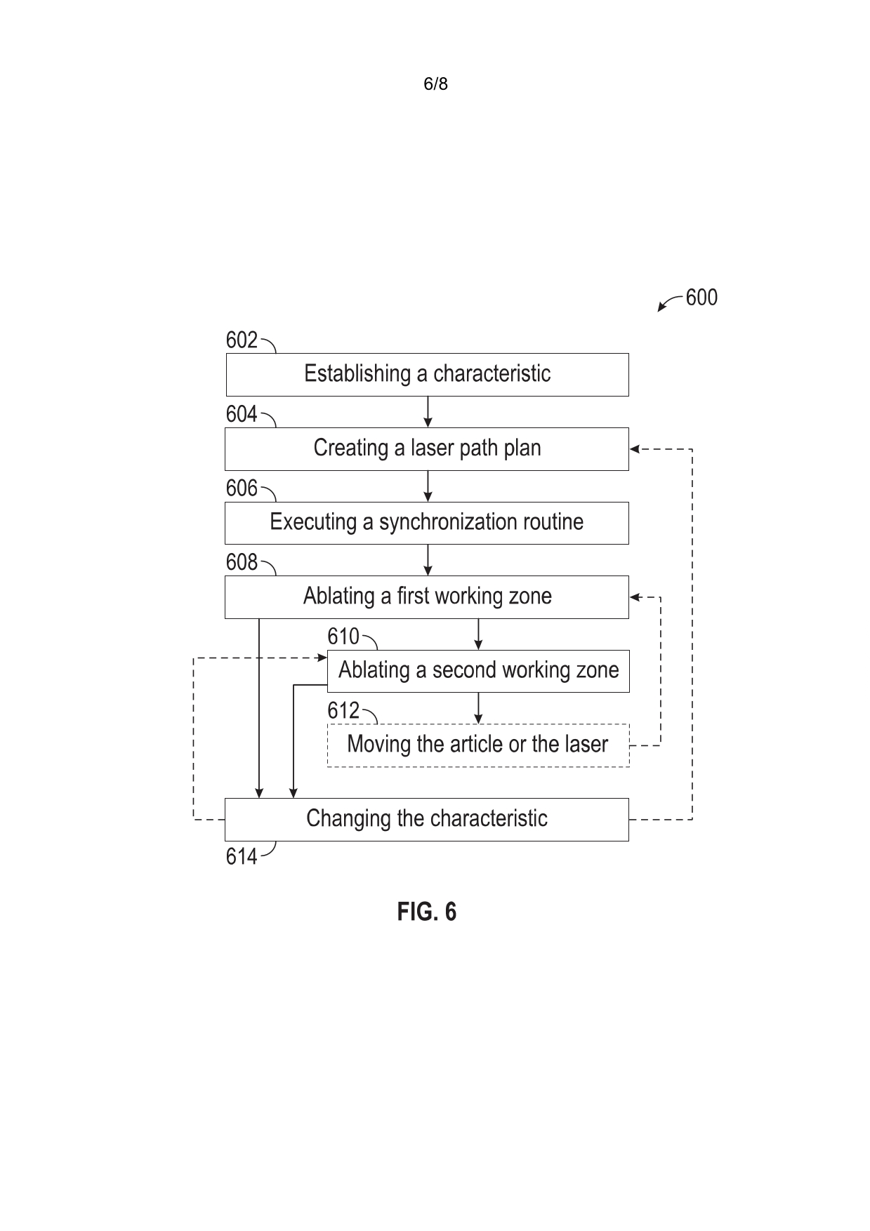 (EN) METHOD AND APPARATUS FOR ABLATING HOLES IN AN ARTICLE ABSTRACT A method (600) of laser ablation of one or more holes (14) in an article (10) includes a step of establishing (602) an ablation characteristic. The ablation characteristic is a laser characteristic, a working zone characteristic, a cooling hole characteristic, or a synchronized machine motion characteristic. A creating step (604) creates a laser path plan for a laser beam based on the established ablation characteristic for a first working zone and a second working zone of the article. An ablating step (608) ablates the first working zone with a first ablation characteristic and afterwards ablates the second working zone with a second ablation characteristic which is different from the first ablation characteristic. [Figure 1] 20